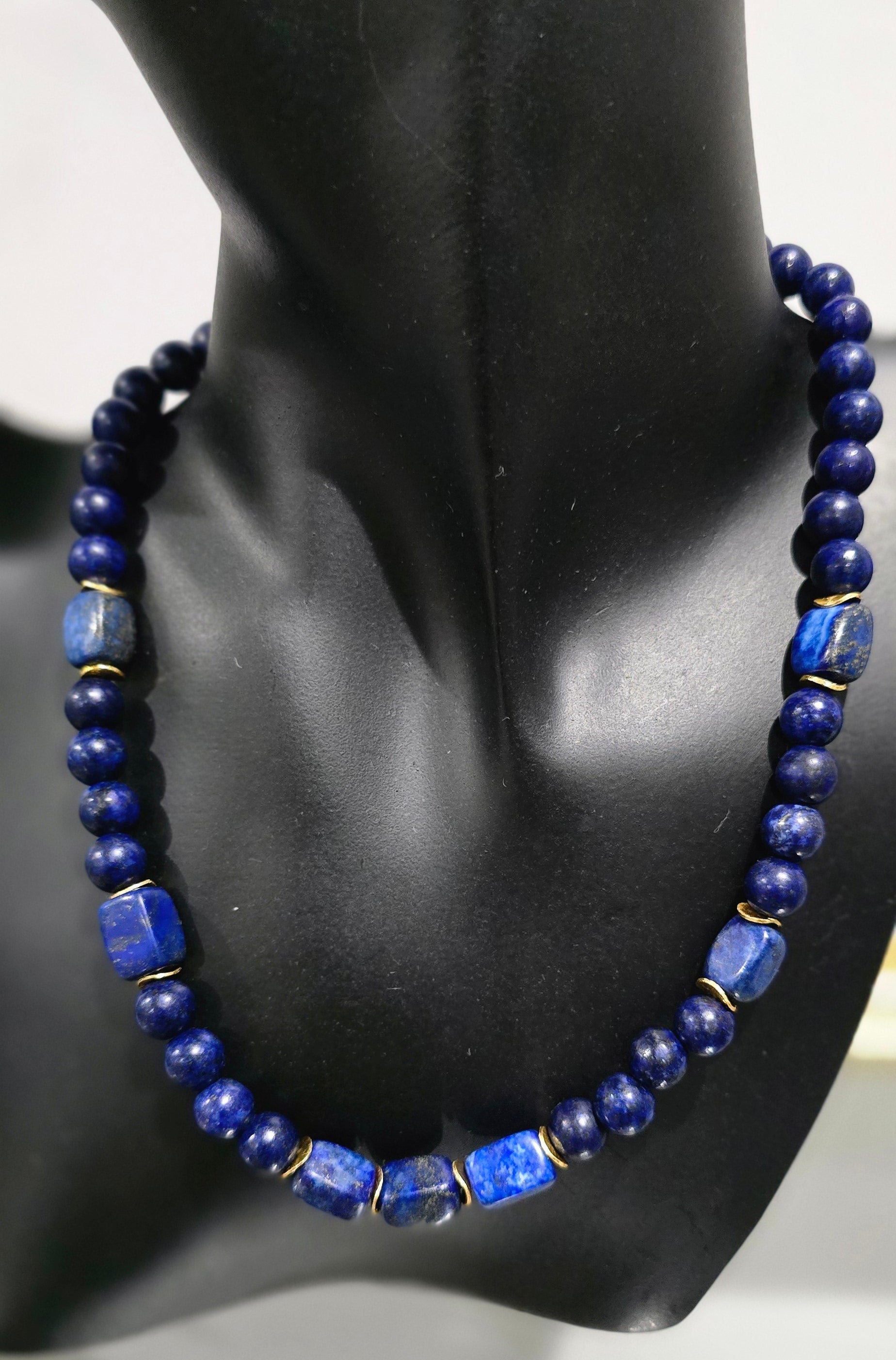 Lapis Lazuli, with its deep celestial blue, has been revered for centuries as a symbol of wisdom and truth. Lapis Lazuli is believed to stimulate the third eye chakra, enhancing intuition and spiritual awareness. It is also known for its protective properties, shielding the wearer from negative energies and promoting a sense of inner peace. Emotionally, this stone encourages self-expression and reveals inner truth, fostering qualities of honesty and compassion. Wearing this Lapis Lazuli necklace can serve as a constant reminder of one's inner strength and the pursuit of enlightenment.